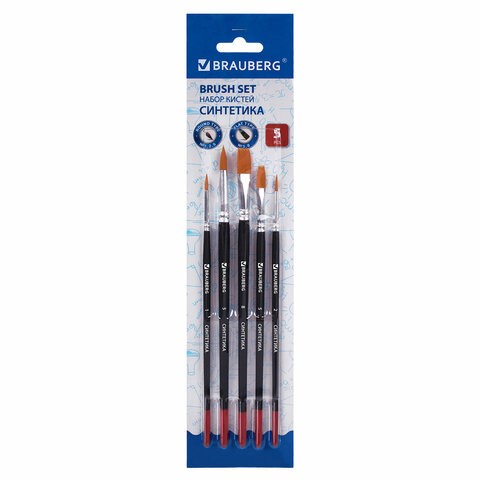Кисти BRAUBERG, набор 5 шт. (синтетика, круглые № 1, 2, 5, плоские № 5, 8), блистер, 200219