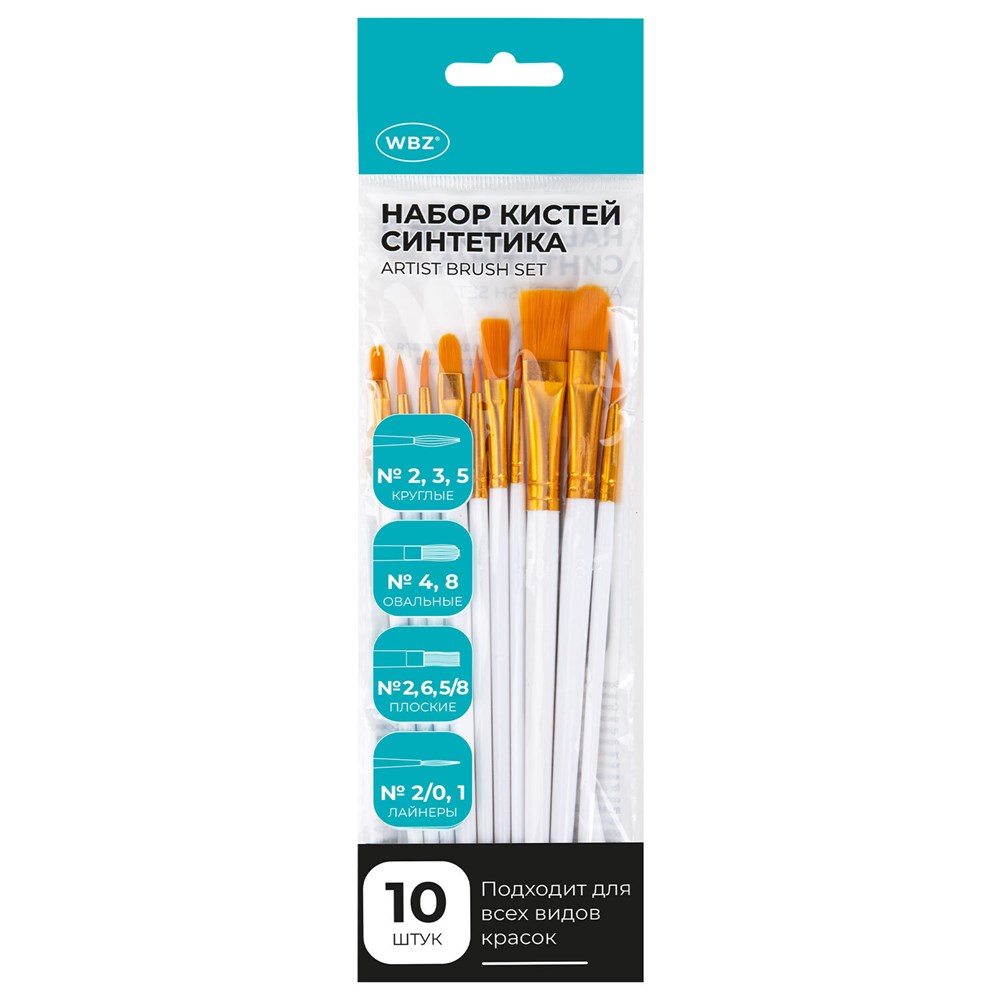 Кисти набор 10 шт., синтетика, белые, № 2/0-8 (Круглые; Овальные; Плоские; Лайнеры), WBZ (ВБЗ), 201087