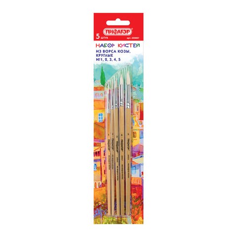 Кисти ПИФАГОР, набор 5 шт. (КОЗА: круглые № 1, 2, 3, 4, 5), блистер с европодвесом, 200887