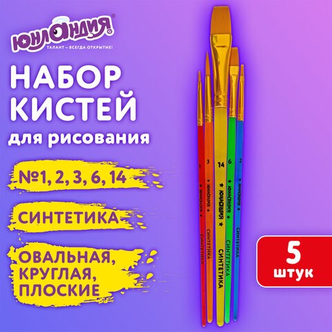 Кисти СИНТЕТИКА набор 5 шт. (круглая 3, плоская 2, 6, 14, овальная 1), блистер, ЮНЛАНДИЯ, 201069