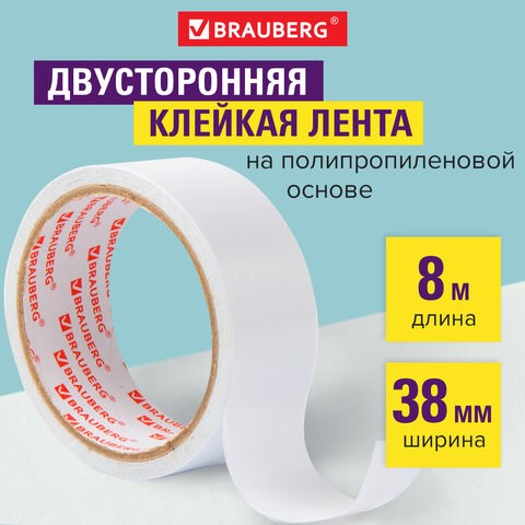 )Двухсторонняя клейкая лента BRAUBERG на основе полипропилена применяется во время мотажных работ внутри помещений, при строительных, монтажных и автомобильных работах.
