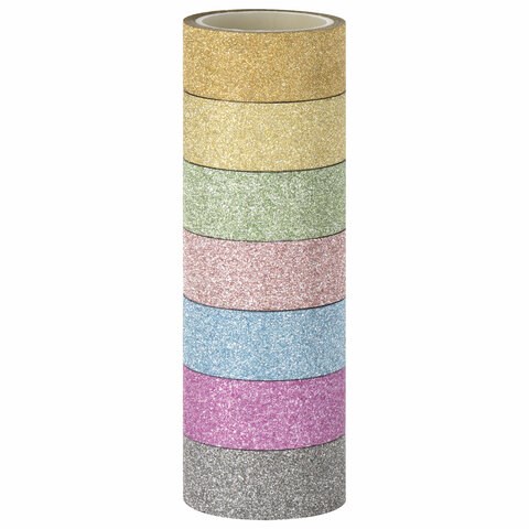 Клейкие ленты полимерные для декора с блестками "ПАСТЕЛЬ", 15 мм х 3 м, 7 цветов, ОСТРОВ СОКРОВИЩ, 661716