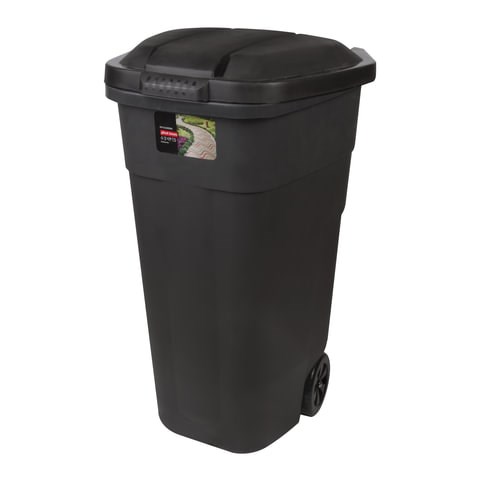 )Пластиковый контейнер большой вместимости (110 л) с крышкой для сбора и транспортировки мусора. Удобная ручка и надежные колеса позволяют легко перемещать контейнер. Для внутреннего и наружного использования.