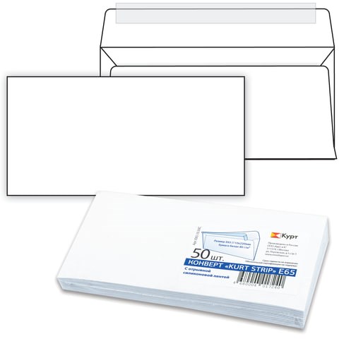 Конверты Е65, КОМПЛЕКТ 50шт., отрывная полоса STRIP, белые, 110х220мм