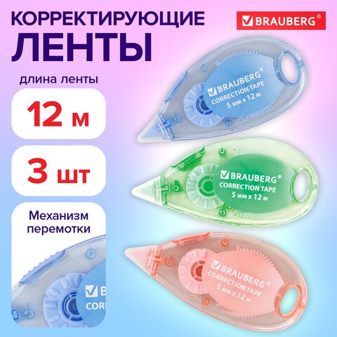 Корректирующая лента BRAUBERG PASTEL, 5 мм x 12 м, механизм перемотки, ВЫГОДНАЯ УПАКОВКА 3 штуки в блистере, 271252