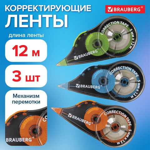 Корректирующая лента BRAUBERG ULTRA COLOR, 5 мм x 12 м, механизм перемотки, ВЫГОДНАЯ УПАКОВКА 3 штук