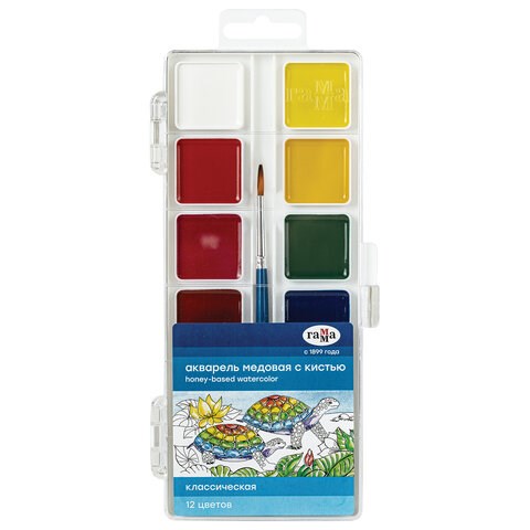 Краски акварельные ГАММА "Классическая", 12 цветов, медовая, c кистью, пластиковая коробка, европодвес, 1009201