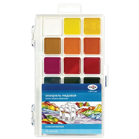)Медовая акварель в обновленной подложке: больший объем краски в кюветах – больше возможностей для творчества. Благодаря качественному прозрачному связующему в составе, цвета акварели яркие и чистые.