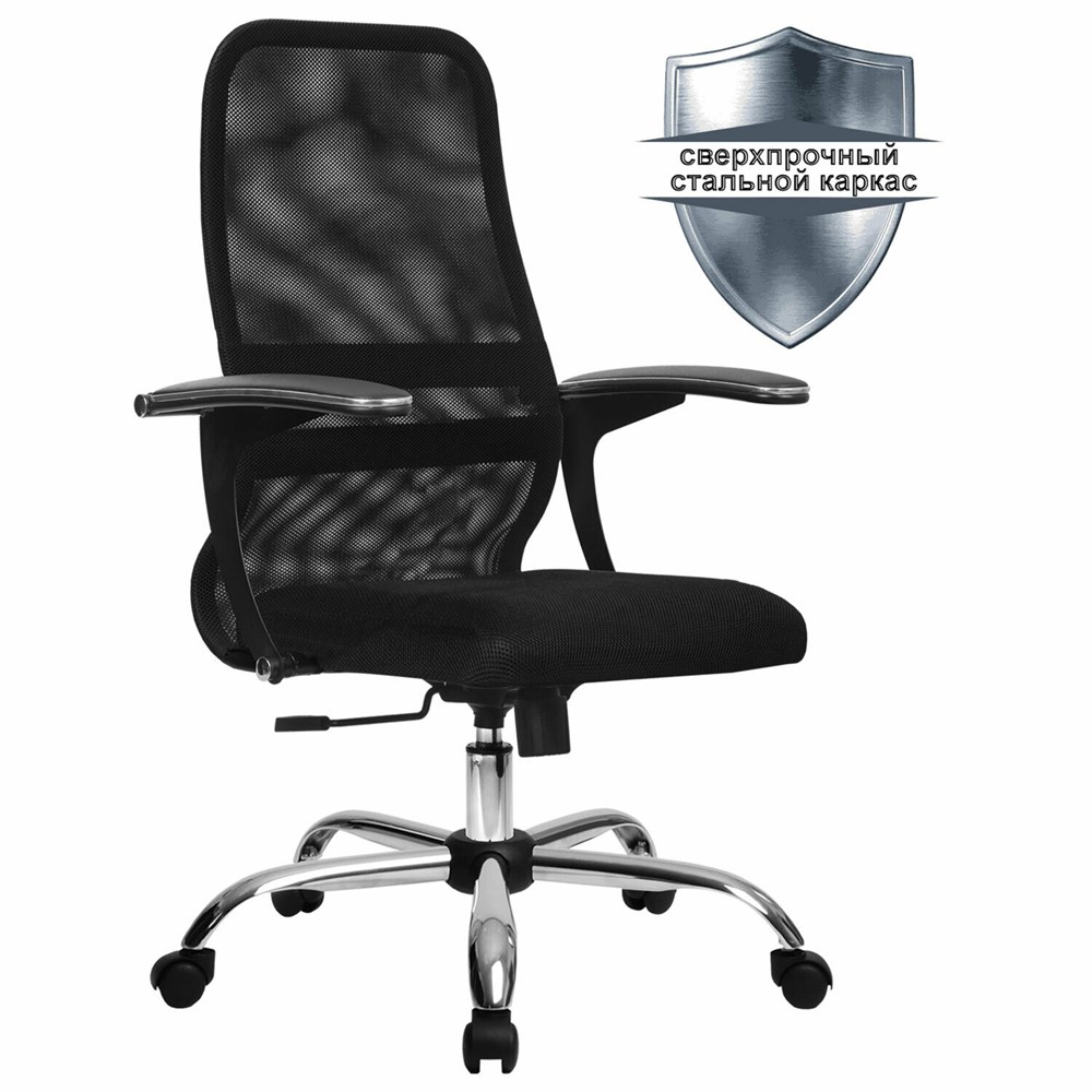 Кресло МЕТТА "SU-C-8-Т" хром, с подлокотниками, ткань-сетка, сиденье мягкое, черное