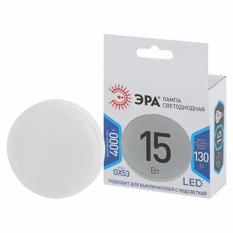 Лампа светодиодная ЭРА STD, 15 (130) Вт, цоколь GX53, таблетка, нейтральный белый свет, 35000 ч., LED GX15W840GX53, Б0036552