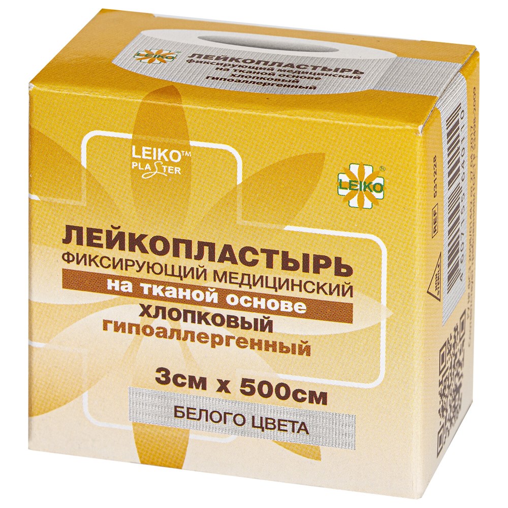 Лейкопластырь медицинский фиксирующий в рулоне LEIKO 3х500 см, на тканевой основе, белого цвета, в картонной коробке