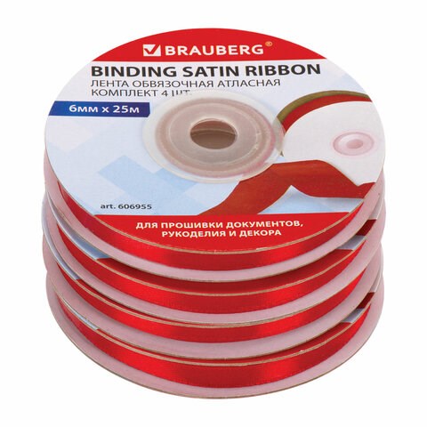 Лента обвязочная атласная КРАСНАЯ, КОМПЛЕКТ 4 шт., ширина 6 мм, длина 25 м, BRAUBERG, 606955