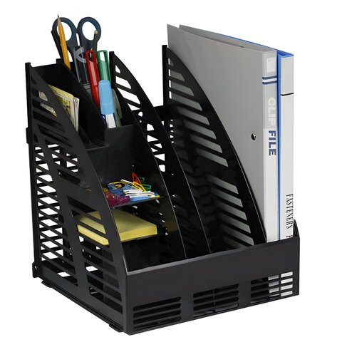 )Уникальная конструкция лотка позволяет наиболее рационально использовать рабочее место. Совмещает классический 3-секционный вертикальный лоток для бумаг А4 и универсальный органайзер для письменных принадлежностей и канцелярских мелочей.