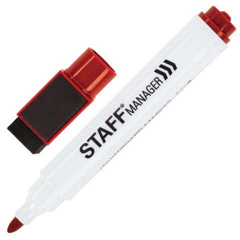 Маркер стираемый для белой доски на магните со стирателем, КРАСНЫЙ, STAFF Manager WBM-002, 3 мм, 152003