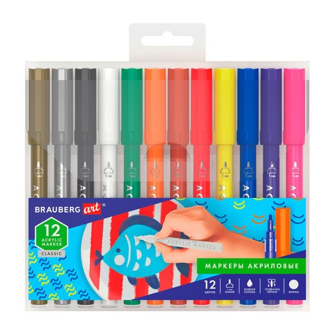 Маркеры акриловые для рисования и хобби BRAUBERG ART CLASSIC, НАБОР 12 цветов, наконечник 1 мм, 152151