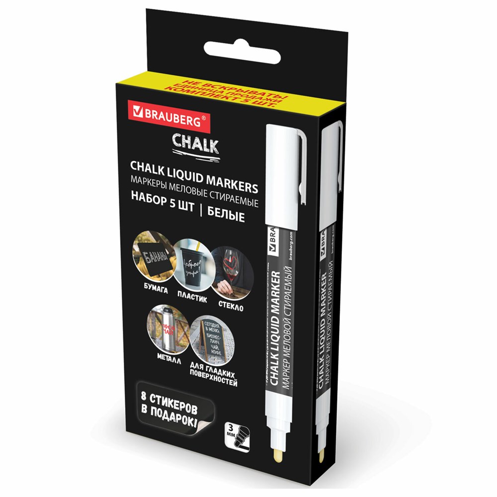 Маркеры меловые CHALK LIQUID MARKER, БЕЛЫЕ, НАБОР 5 шт., 3 мм, СТИКЕРЫ В ПОДАРОК, BRAUBERG, 152596