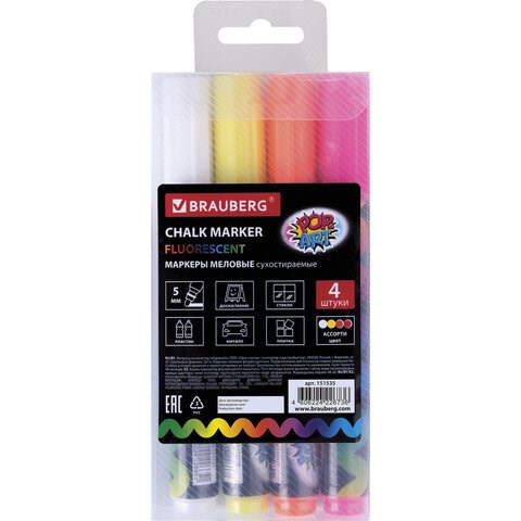 Маркеры меловые "POP-ART", НАБОР 4 ЦВЕТА, 5 мм, стираемые, для гладких поверхностей, BRAUBERG, 151535