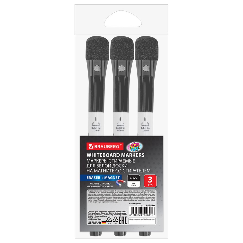 Маркеры на магните со стирателем для белой доски и планера, 3 шт., черные, BRAUBERG POP-ART, 1-2 мм, 152570