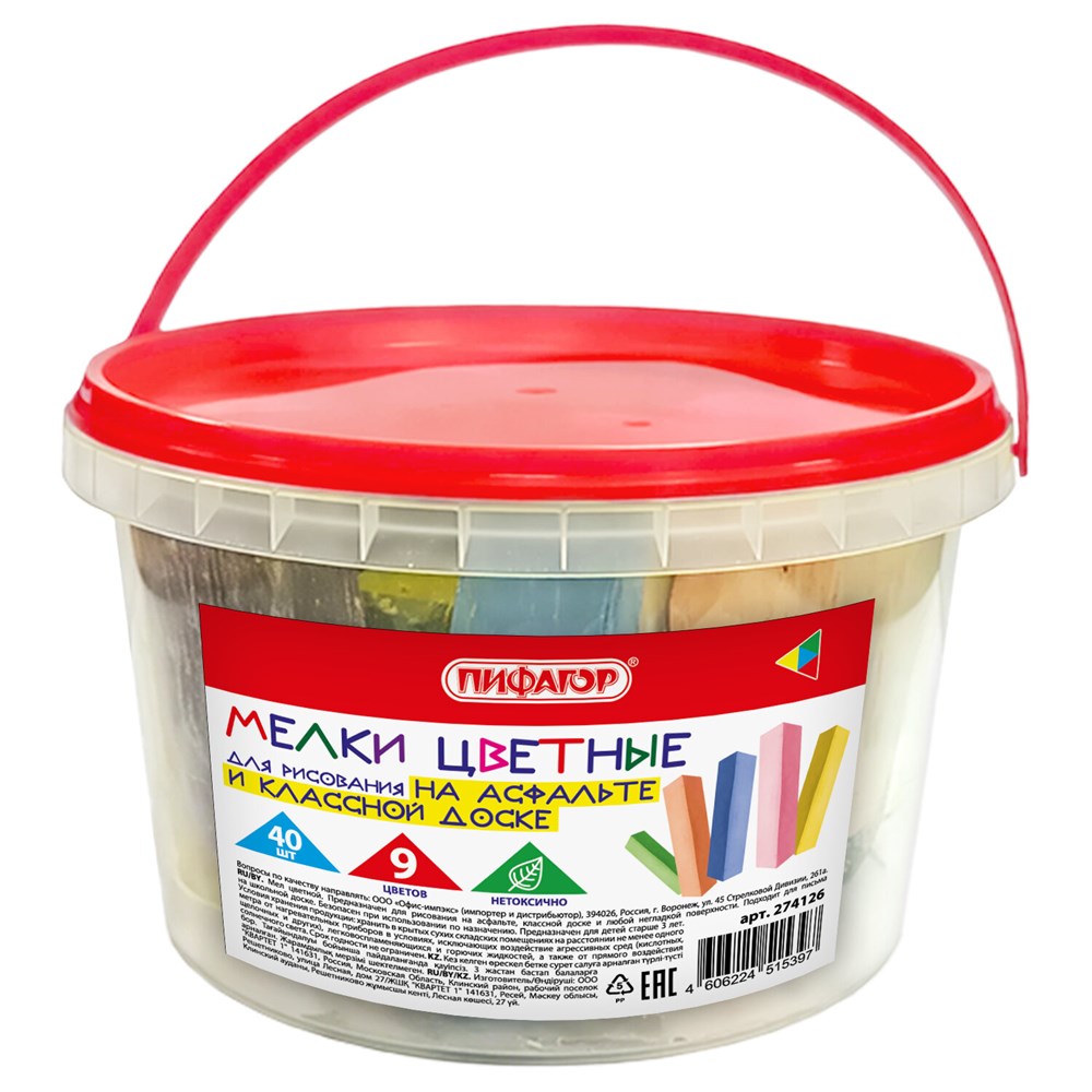 Цветной мел ПИФАГОР подходит для рисования на школьной доске и асфальте.В наборе 40 ярких мелков девяти различных цветов: голубой, фиолетовый, зеленый, изумрудный, желтый, красный, оранжевый, белый, коричневый. Благодаря квадратной утолщенной форме с заостренным концом мел удобно ложится в руку и рисует на асфальте. Изготовлен из высококачественного природного сырья без добавления гипса, нетоксичен. Легко смывается с рук. Мел упакован в пластиковое ведерко – идеально, чтобы хранить мел или брать его с собой.