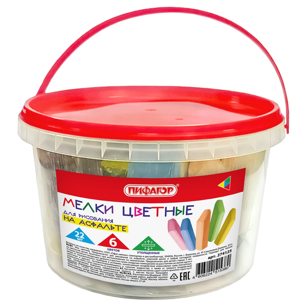 Мел в ведерке для рисования на асфальте 22 штуки, ПИФАГОР, цветной квадратный утолщенный, 274125