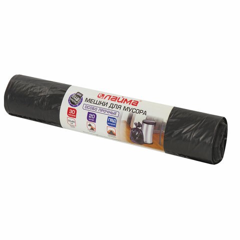 Мешки д/мусора 30л черные в рулоне 20 шт., ПВД, 20 мкм, 50х60 см (±5%), особо прочные, ЛАЙМА