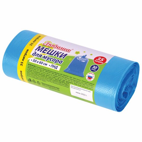 Мешки для мусора 35 л синие, в рулоне 30 шт., ПНД 10 мкм, 50х60 см, ЛЮБАША, 608091