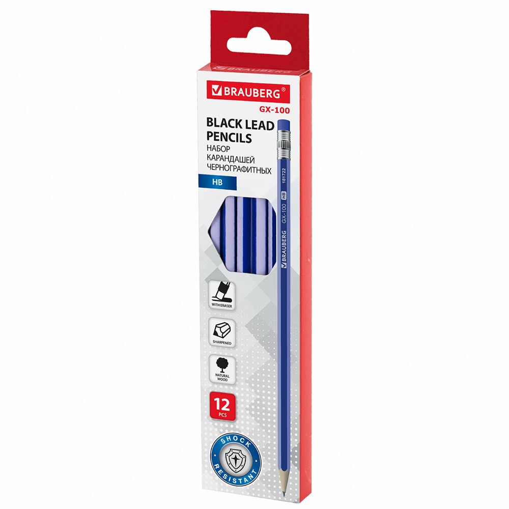 Набор карандашей чернографитных BRAUBERG "GX-100" 12 шт., HB, с ластиком, корпус синий, 181722