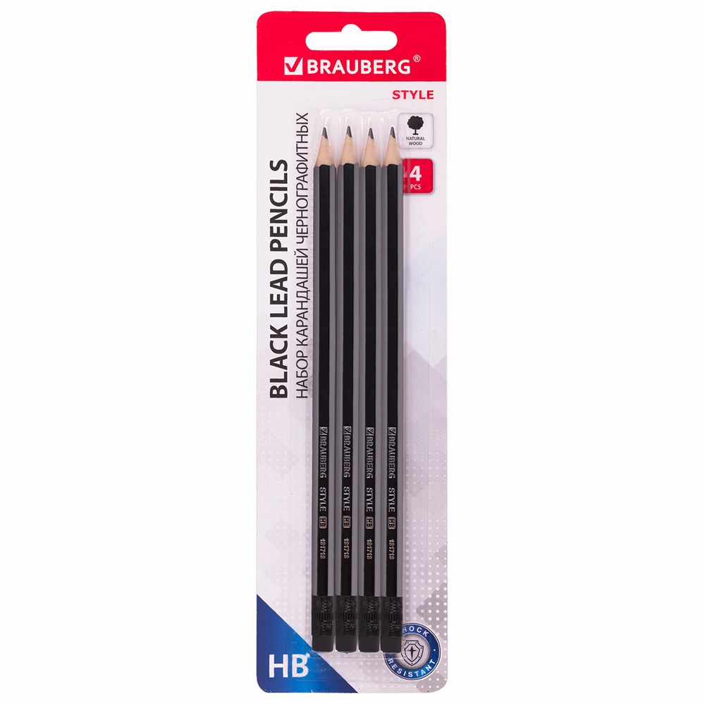 Набор карандашей чернографитных BRAUBERG "Style" 4 шт., HB, с ластиком, корпус черно-серый, 181718