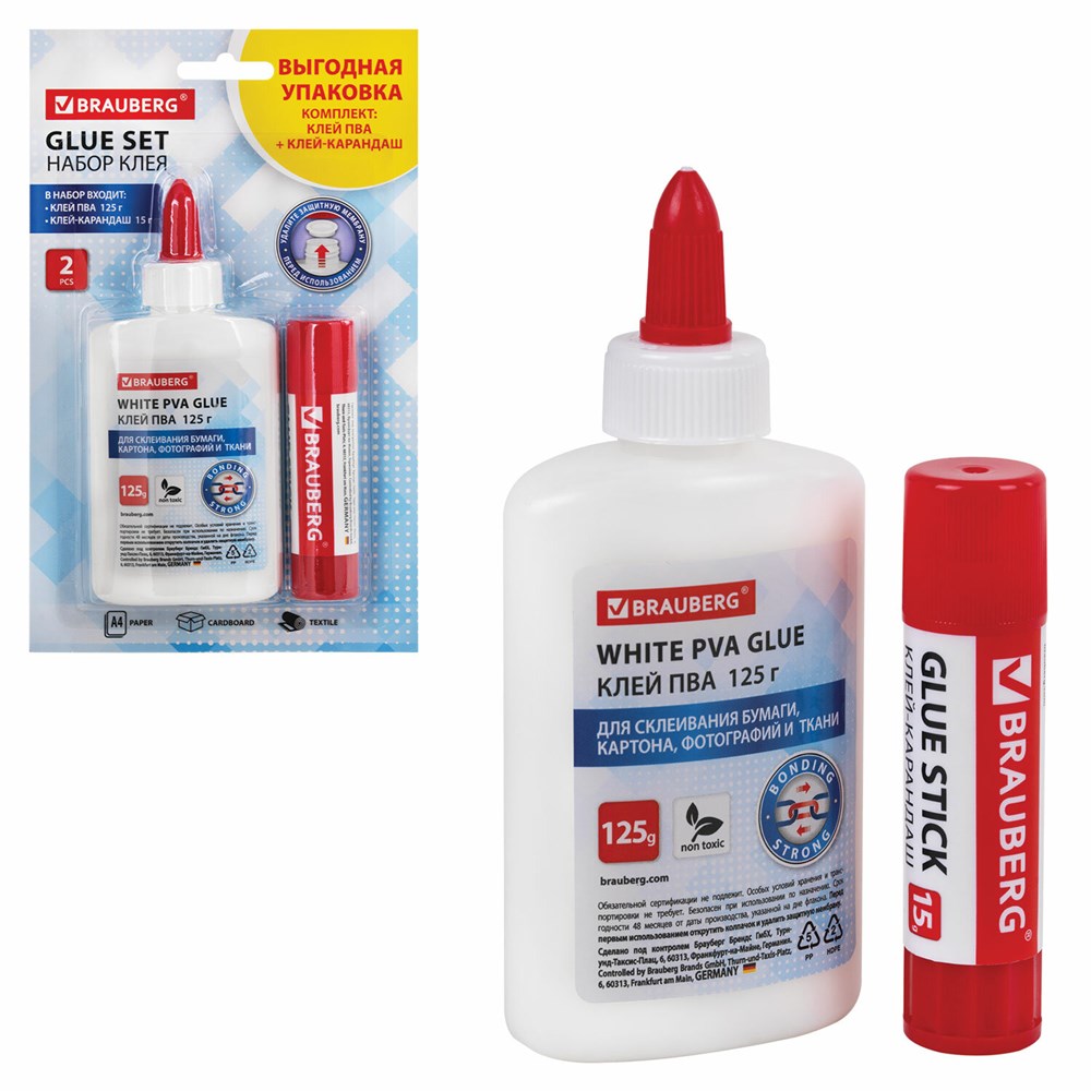 Набор клея BRAUBERG (клей-карандаш PVP 15 г, клей ПВА 125 г), блистер, 271980