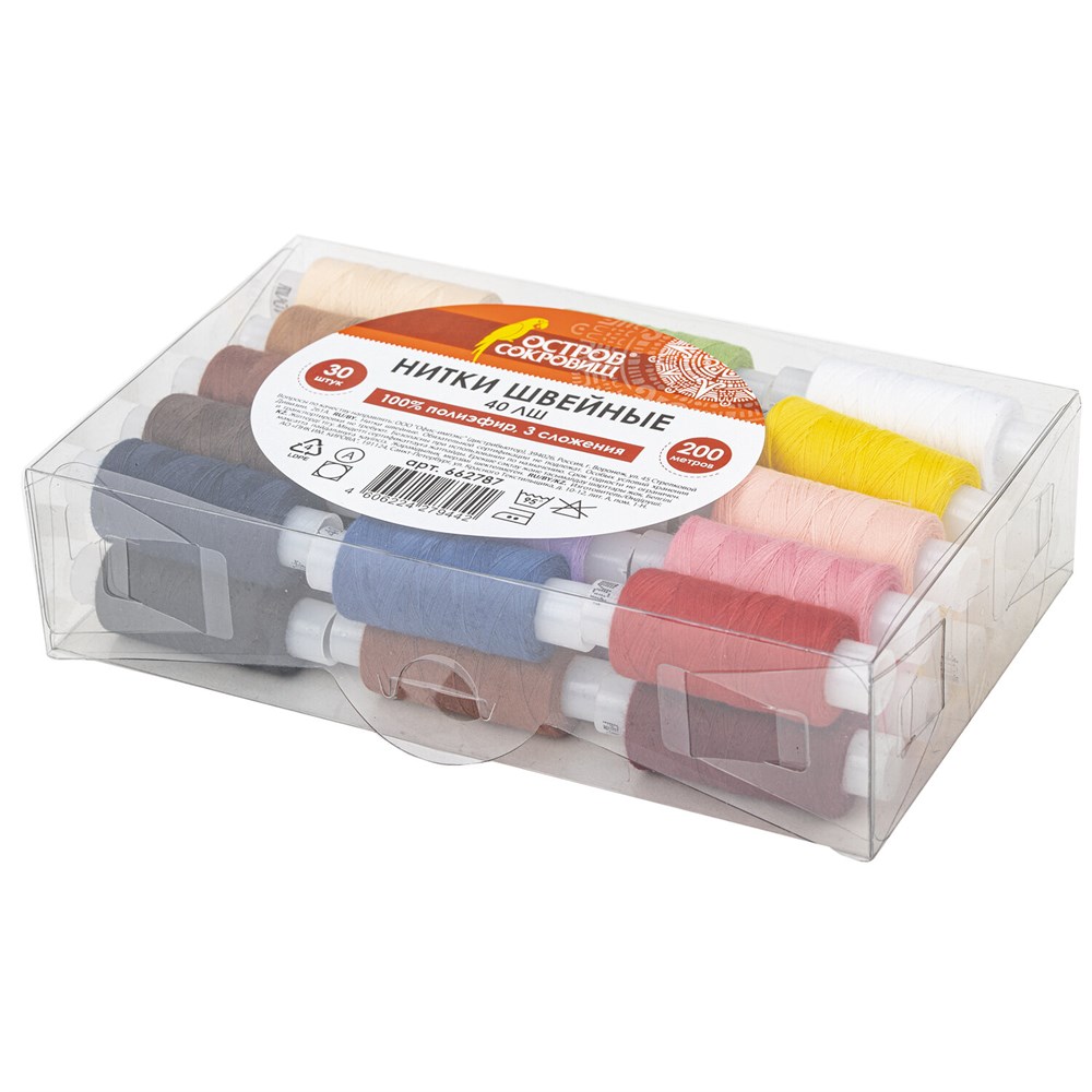 Набор швейных ниток, 30 цветов по 200 м, в боксе, 40 ЛШ, ОСТРОВ СОКРОВИЩ, 662787