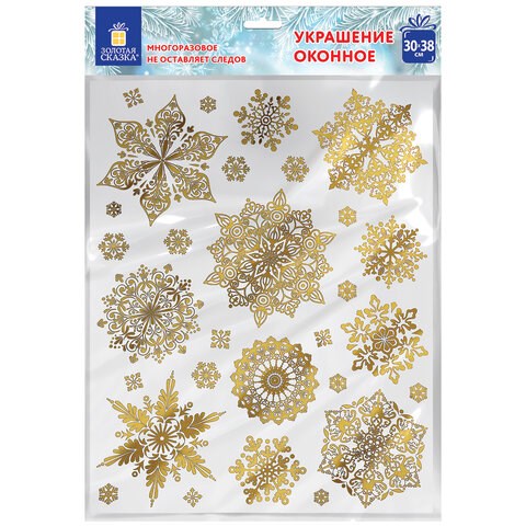 Наклейка для окон двусторонняя МНОГОРАЗОВАЯ 30х38 см, Снежинки, фольга, золото, ЗОЛОТАЯ СКАЗКА, 591927