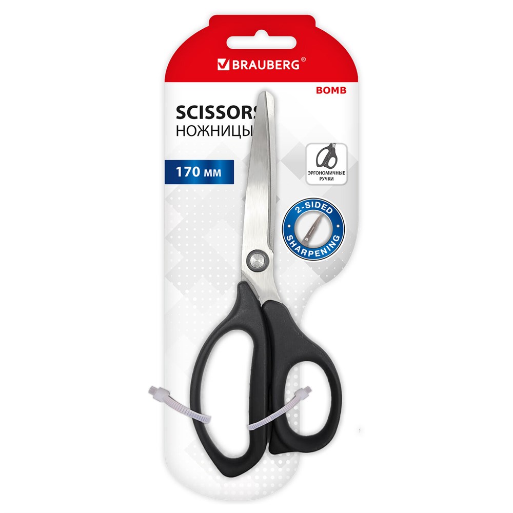 Ножницы BRAUBERG "BOMB" сочетают в себе максимальную функциональность и эстетичный внешний вид. Модель отлично подходит для резки бумаги, картона и прочих материалов.Примечательная особенность ножниц BRAUBERG "BOMB" - ручки из пластика повышенной прочности. Лезвия выполнены из нержавеющей стали и отличаются устойчивостью к негативным факторам внешней среды. Двусторонняя заточка делает лезвия максимально острыми: даже в условиях интенсивной эксплуатации режущие свойства не вызывают нареканий. Общая длина инструмента – 170 мм.