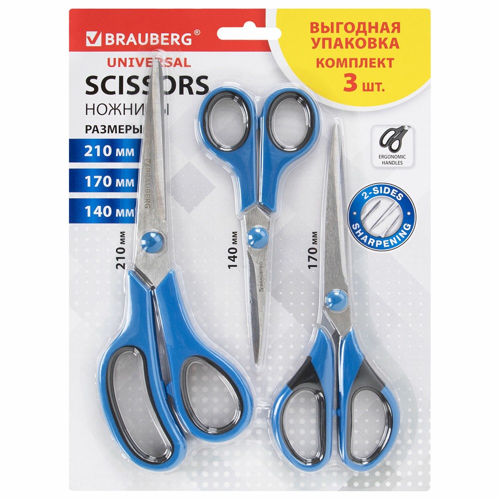 Ножницы BRAUBERG "UNIVERSAL" 3 шт. (140, 170, 210 мм), черно-синие ручки, ВЫГОДНАЯ УПАКОВКА, 272978