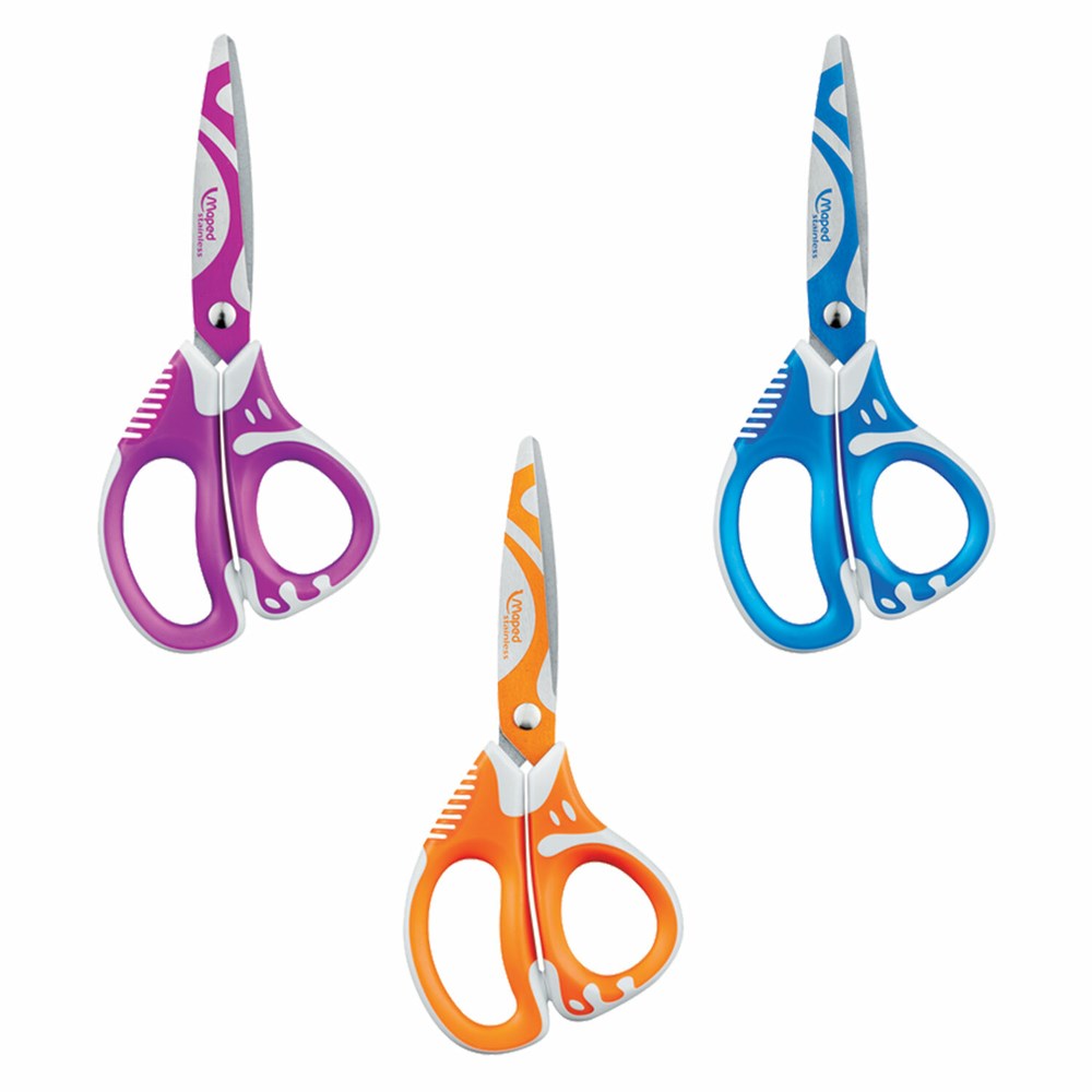 Ножницы MAPED "Zenoa Fit" с цветной печатью на лезвиях. Ручки асимметричной формы с мягкими вставками обеспечивают комфортное использование.Эксклюзивный дизайн. Высокое качество разрезов благодаря прочным лезвиям из нержавеющей стали и металлической заклёпке. Закруглённые концы лезвий для повышенной безопасности. Асимметричные кольца с прорезиненной зоной захвата и системой "антишок" для максимального комфорта. Стойкий рисунок не стирается со временем и сохраняет яркость цвета. Цвет – белый с декором-ассорти: синий, оранжевый, сиреневый. Длина – 13 см.
