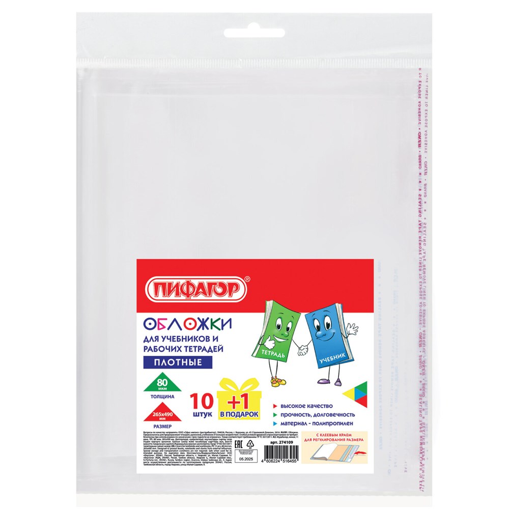 Обложки ПП для учебников и рабочих тетрадей, КЛЕЙКИЙ КРАЙ, НАБОР 10 шт. + 1 шт., 80 мкм, 265x490, ПИФАГОР, 274109