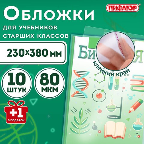 Обложки ПП для учебников старших классов, НАБОР "10 шт. + 1 шт. в ПОДАРОК", 80 мкм, 230х380 мм, универсальные, прозрачные, ПИФАГОР, 272707