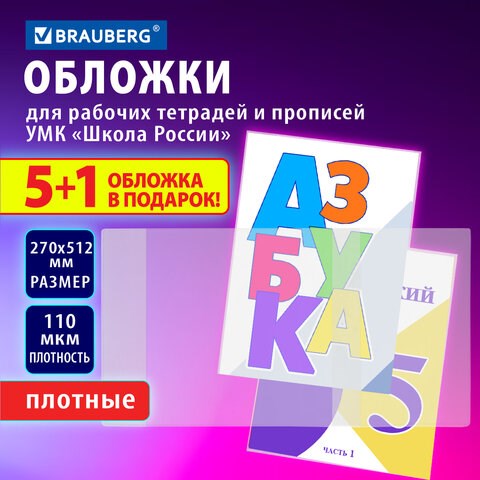 Обложки ПВХ для рабочих тетрадей и прописей, НАБОР "5 шт. + 1 шт. в ПОДАРОК", ПЛОТНЫЕ, 110 мкм, 270х512 мм, универсальные, BRAUBERG, 272696