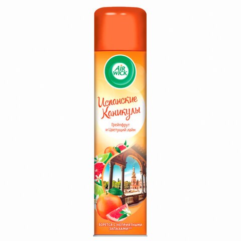 )Аэрозоль-освежитель воздуха AIRWICK «Испанские каникулы» из новой коллекции «Ароматы мира» эффективно борется с неприятными запахами, создавая заряд солнечного настроения Испании с цитрусовыми ароматами грейпфрута и цветущего лайма...
