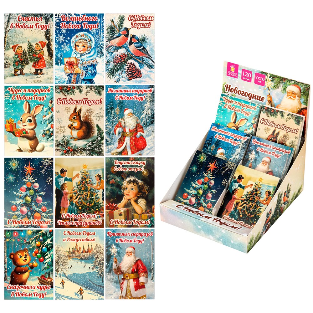 Открытки поставляются в ярком картонном дисплее, на котором изображены теплые зимние иллюстрации.