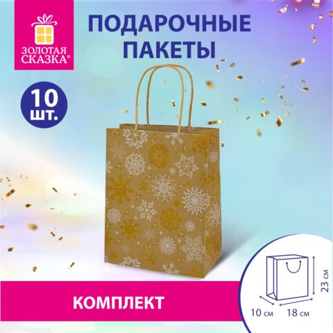 Пакет подарочный КОМПЛЕКТ 10 штук новогодний 18x10x23 см, "Снежинки", ЗОЛОТАЯ СКАЗКА, 592126