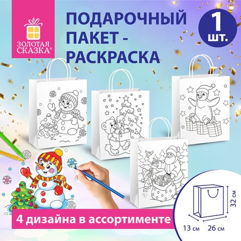 )Подарочный пакет-раскраска ЗОЛОТАЯ СКАЗКА – отличное решение для упаковки любого презента, которое позволит легко и со вкусом оформить выбранный подарок.