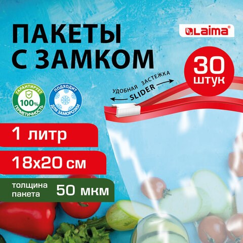 Пакеты для заморозки продуктов, 1 л, КОМПЛЕКТ 30 шт., с замком-застежкой (слайдер), LAIMA