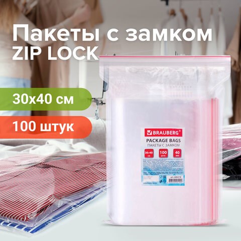 Пакеты с замком "зиплок" (гриппер), комплект 100 шт., 300х400 мм, ПВД, толщина 40 микрон, BRAUBERG,