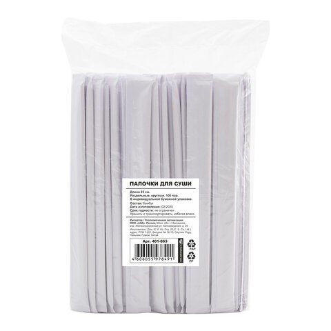Палочки для суши бамбуковые 23 см, круглые, КОМПЛЕКТ 100 пар в индивидуальной бумажной упаковке, СТАНДАРТ, 401-863