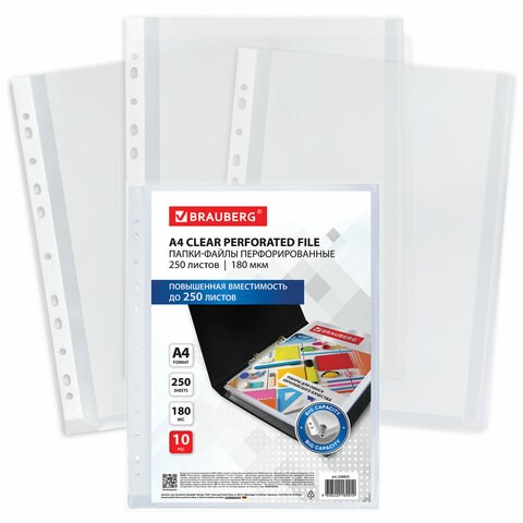 Папка-файл перфорированная,КОМПЛЕКТ 10 шт,А4, BRAUBERG, 0,18 мм,до 200 листов,