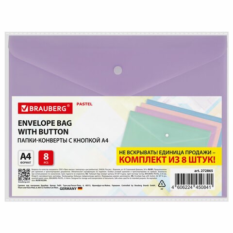 Папка-конверт с кнопкой А4, КОМПЛЕКТ 8 шт., пастельные цвета ассорти, BRAUBERG "PASTEL", 0,18 мм, 272865