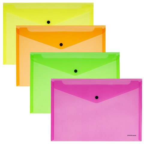 Папка-конверт с кнопкой ERICH KRAUSE "Glossy Neon", А4, до 120 листов, прозрачная, ассорти, 0,18 мм, 50300