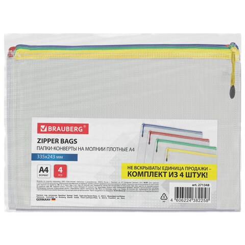 )Комплект папок-конвертов на молнии BRAUBERG из 4 штук формата А4 идеально подойдет для хранения и транспортировки бумаг и документов.