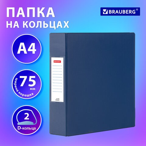 Папка на 2 кольцах, ПРОЧНАЯ, картон/ПВХ, BRAUBERG "Office", СИНЯЯ, 75 мм, до 500 листов, 271845