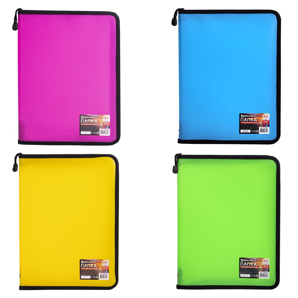 Папка на молнии пластиковая BRAUBERG, А4, 325х230 мм, 4 цвета ассорти, неоновая, 224054